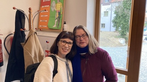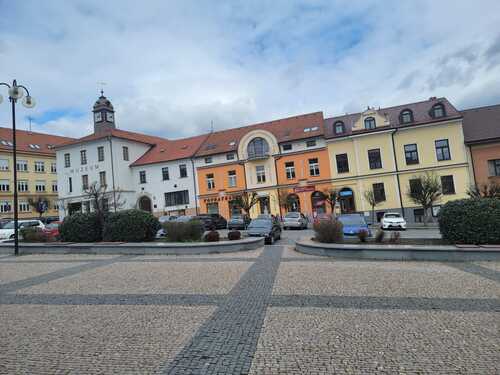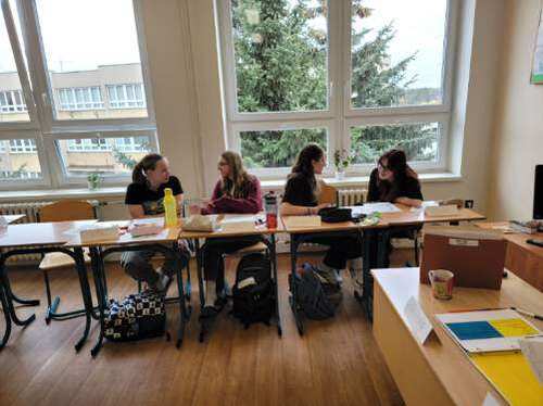 Sherry and I were ready to meet our students. We had sixteen Tercie Beta (13/14) year olds for the week. We were super excited to meet our students and begin our teaching lessons. We enjoyed a brisk cool walk to the school from the community center & saw a few snow flurries. The town of Sedlecany was bustling with people getting to school and work for the first day of the week. It was so nice to see all the shops and bakeries open for business as everything was closed yesterday. Then we were at the school. The first thing we learned was that in Czech you don't wear our outside walking into schools and homes, so you must carry a pair of indoor shoes with you. As soon as we entered the school, we took off our outside shoes and wore our "slippers" or indoor shoes. Our team agreed that this was pretty nice and we could get use to wearing our "slippers" to work. After a brief tour of the school, we headed to our classroom and anxiously awaited to meet our students.
