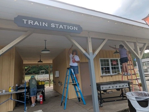 Today was our 4th day at Word of Life Bible Institute. After a delicious breakfast of pancakes, we went to the train station at Ranch / Ridge area to continue painting. With brush in hand, the two of us started edging the walls of the train station building in yellow. Almost the entire team went to paint except for two dads who were finishing putting the new roof on the Ranch office.